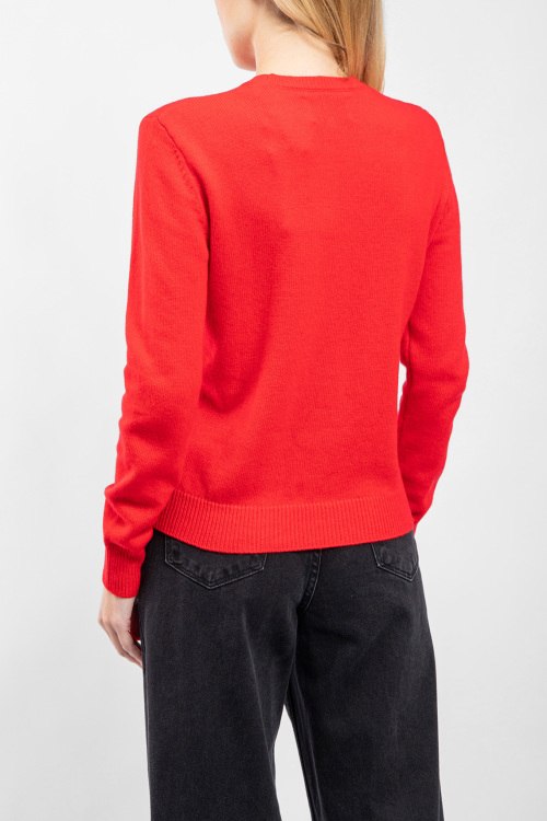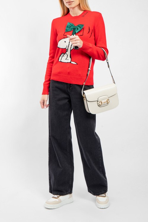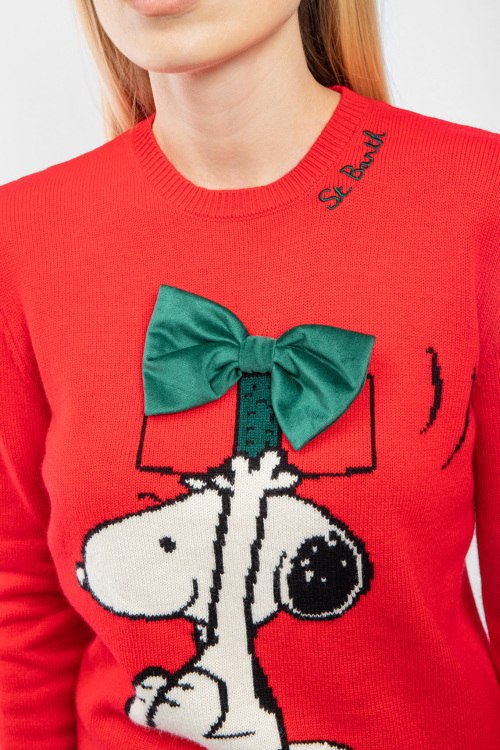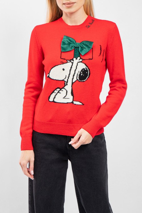 Женский красный джемпер из шерсти и вискозы Snoopy от Mc2 Saint Barth (Mc2 Сент Барт). Графический узор, вышитый логотип, нашивка с бантиком, круглый вырез горловины, классическая длина, манжеты и нижний край в рубчик.