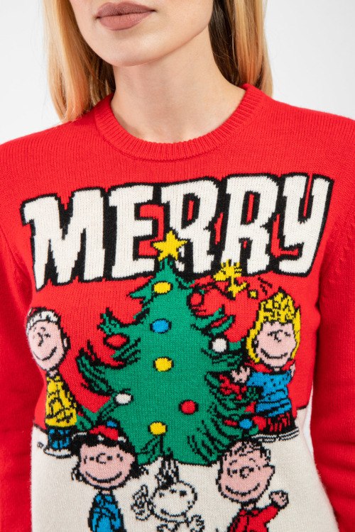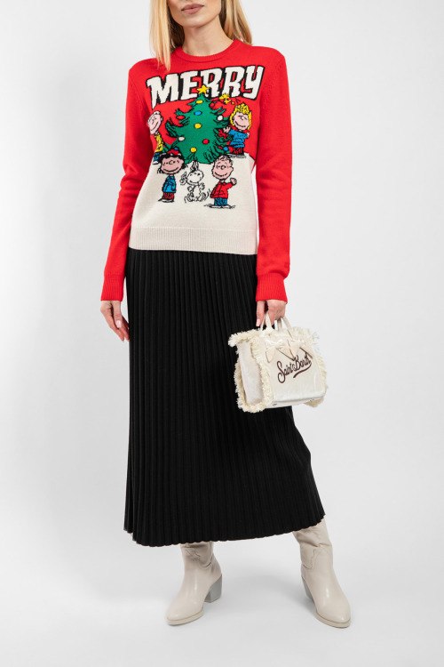 Женский красный джемпер New Queen with Peanuts из шерстяного микса от Mc2 Saint Barth (Mc2 Сент Барт). Круглый вырез горловины, длинные рукава, дизайн с принтом, манжеты и низ изделия на трикотажной резинке.