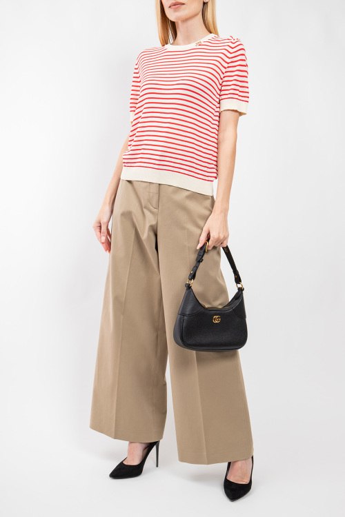 Женский молочно-красный трикотажный джемпер от Roberta Biagi (Роберта Бьяджи). Полоска по всей поверхности, круглый вырез горловины, значок с логотипом, короткий рукав, классическая длина. Замеры для размера UNI: длина спереди: 57 см, ширина по груди: 49 см, ширина по талии: 48 см, длина рукава: 6,5 см, ширина рукава: 16 см.