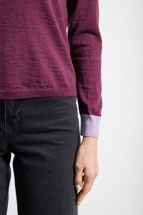 Детали: Женский джемпер из шерсти цвета марсало от NIU (Ниу). Классическая длина, круглый вырез горловины, длинные рукава, контрастная трикотажная резинка на манжетах