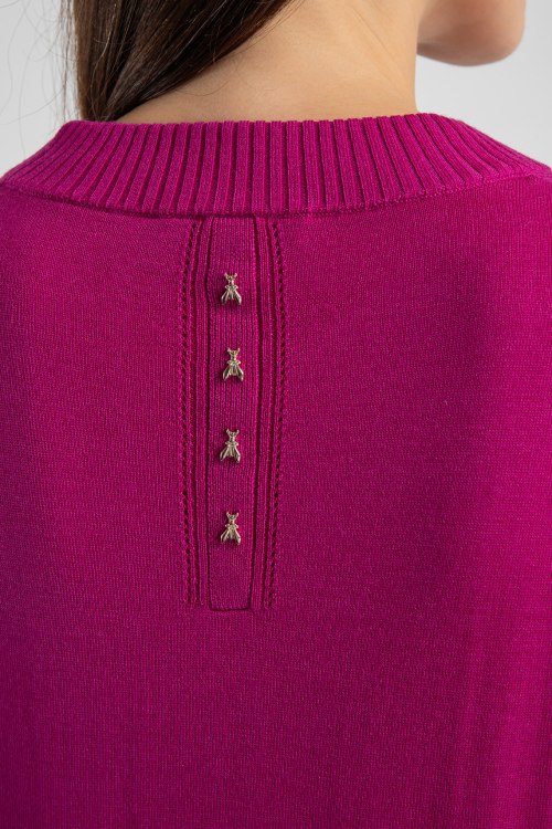 Женский малиновый джемпер из шерсти от Patrizia Pepe (Патриция Пепе). Удлиненный дизайн, круглый вырез горловины, длинные рукава, трикотажная резинка на манжетах и по низу изделия, декор: на спине металлическая брендированная фурнитура.