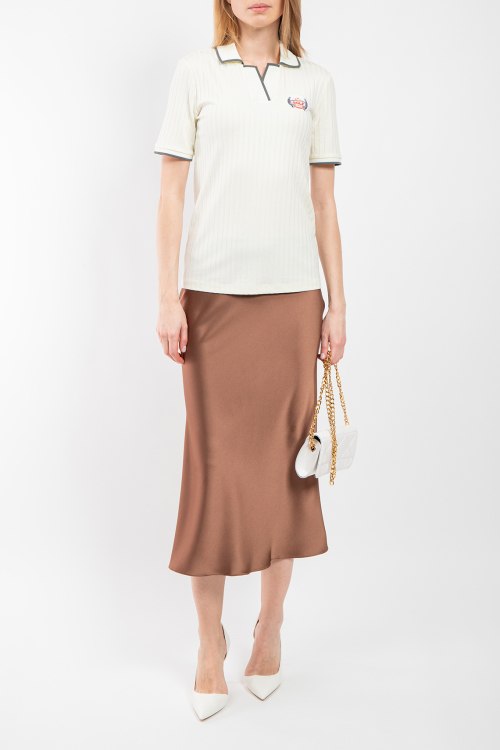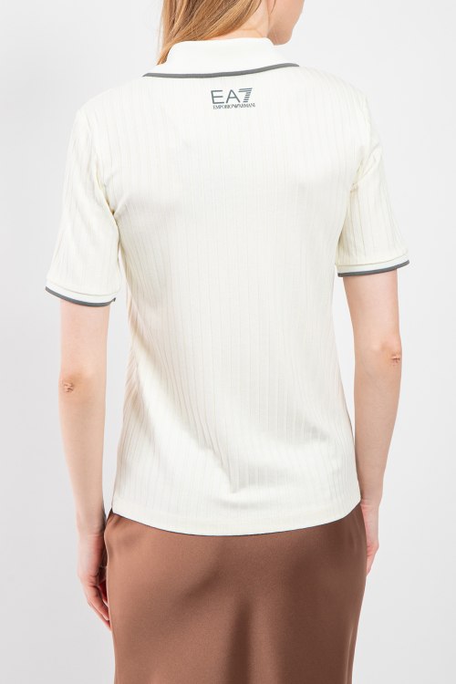 Женский джемпер-поло молочного оттенка из вискозы и полиамида от EA7 Emporio Armani (ЕА7 Эмпорио Армани). Дизайн в рубчик, классический воротник, V-образный вырез горловины, короткие рукава, патч-лого, контрастная окантовка.