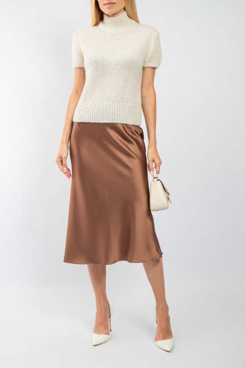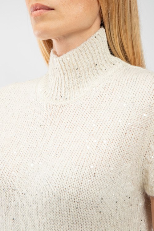 Женский вязаный джемпер молочного оттенка от Barbara Alvisi (Барбара Алвиси). Дизайн с пайетками по всей поверхности, высокая горловина, короткий рукав, классическая длина. На модели снят размер - 27. Параметры модели: рост 177 см, 88-62-90 см. Замеры: длина: 53 см, ширина по груди: 45 см, ширина по талии 42 см, ширина рукава 12 см.