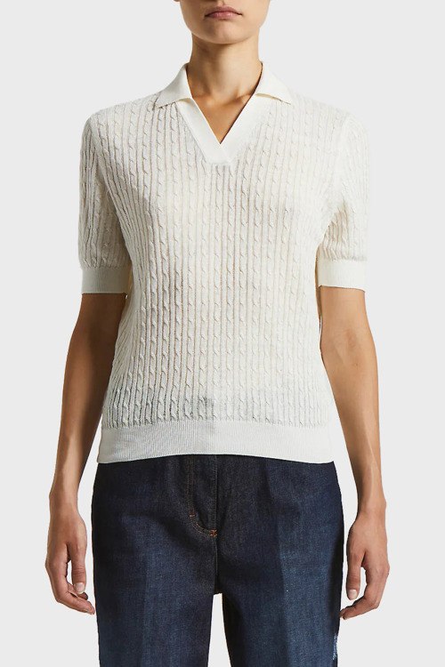 Детали: Женский кремовый джемпер-поло из льна и хлопка от Cappellini (Каппеллини). Узор косичкой, отложной воротник, V-образный вырез, короткий рукав, классическая длина