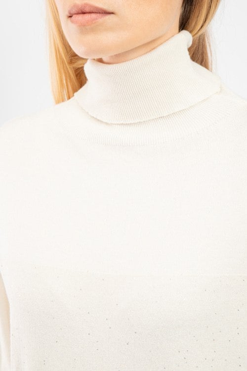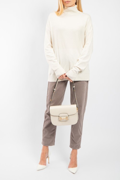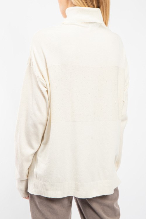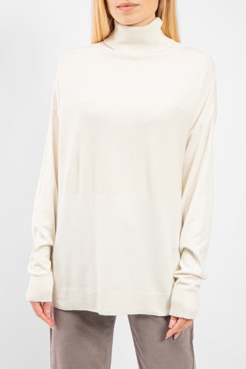 Женский кремовый трикотажный джемпер от Clothe (Клозе). Высокая горловина, свободный фасон, удлиненная длина, манжеты и нижний край в рубчик. Размер вещи на фото: UNI. Замеры: длина спереди: 69 см, ширина по груди: 60 см, ширина по талии 56 см, ширина по бедрам 56 см, длина рукава 54 см, ширина рукава 18 см.
