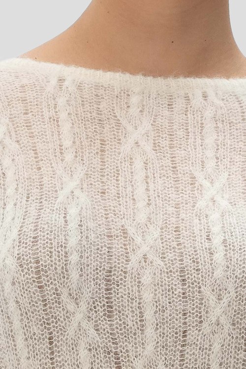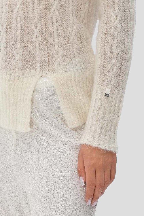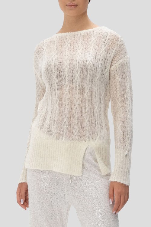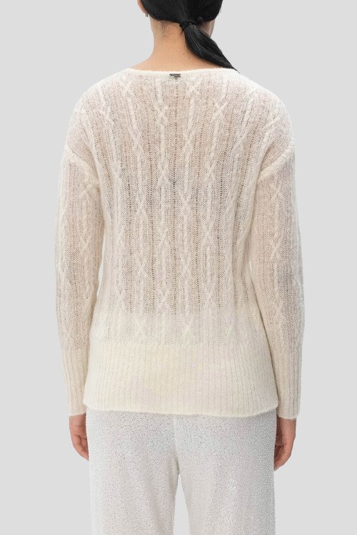 Детали: Женский джемпер молочного оттенка из альпаки и шерсти от Herno (Эрно). Полупрозрачная модель, комбинированная вязка, вырез горловины-лодочка, разрез сбоку, классическая длина