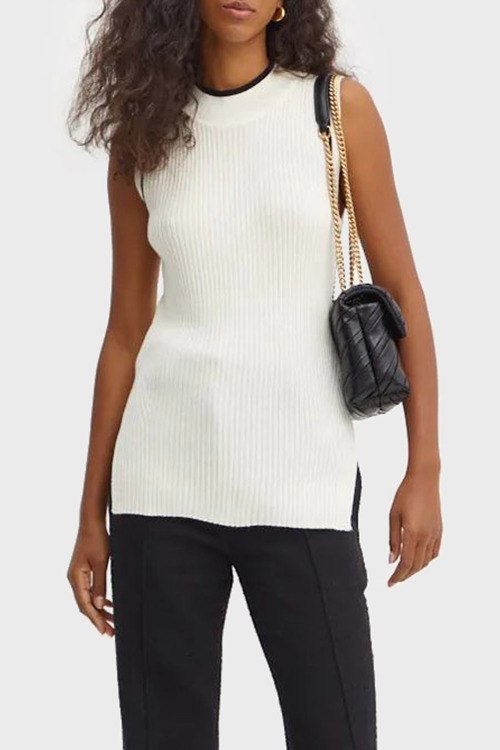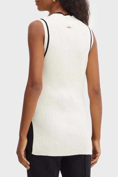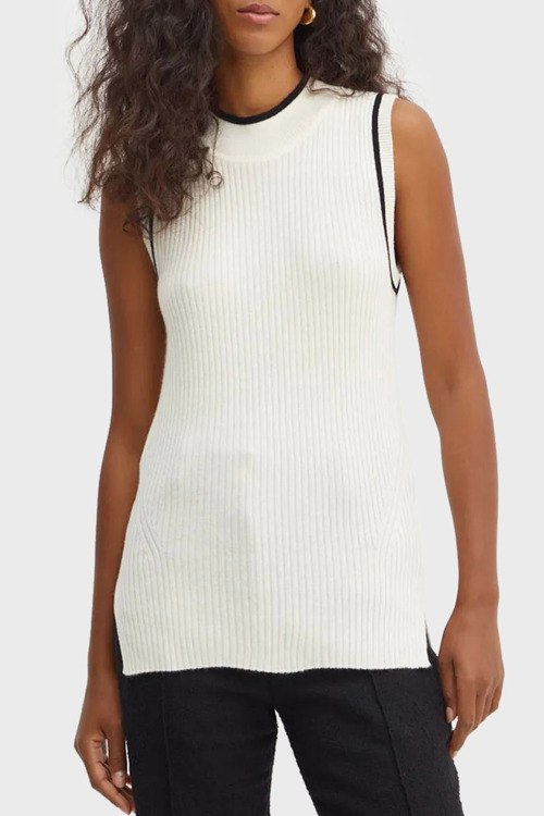 Детали: Женский джемпер молочного оттенка из шерсти и кашемира от Hugo Boss (Хуго Босс). Удлиненная модель, дизайн в рубчик, круглый вырез горловины, модель без рукавов, по бокам разрезы