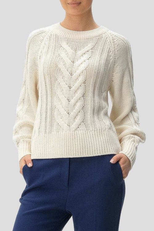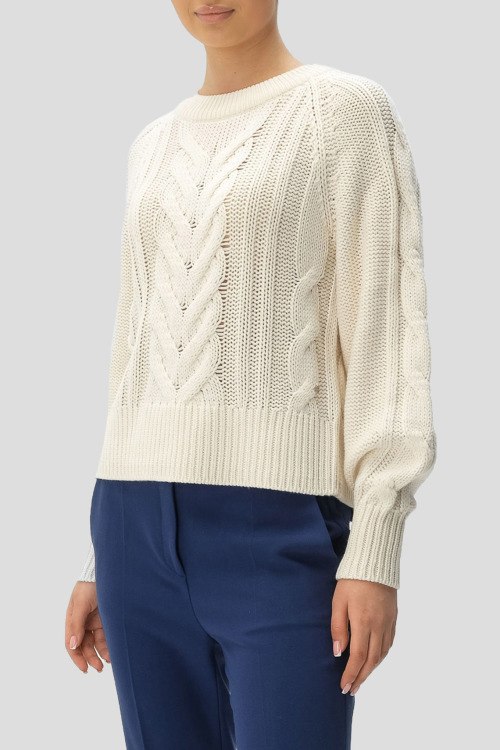 Детали: Женский джемпер молочного оттенка из шерсти и акрила от Hugo Boss (Хуго Босс). Классическая длина, круглый вырез горловины, длинные рукава, декоративная спинка со шнуровкой, манжеты в рубчик