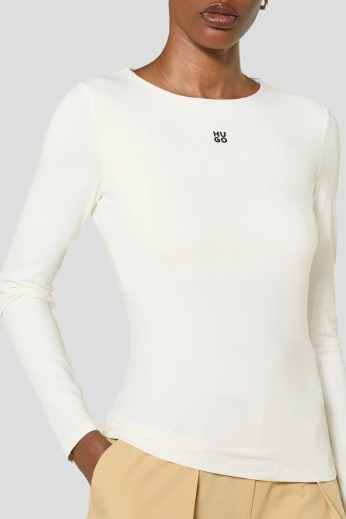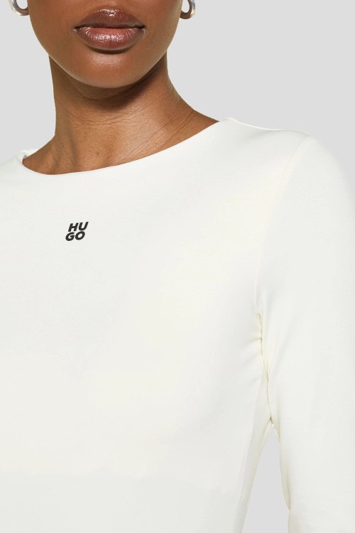 Детали: Женский лонгслив молочного оттенка Dasiia от Hugo by Hugo Boss (Хуго бай Хуго Босс). Логотип на груди, круглый вырез горловины, классическая длина