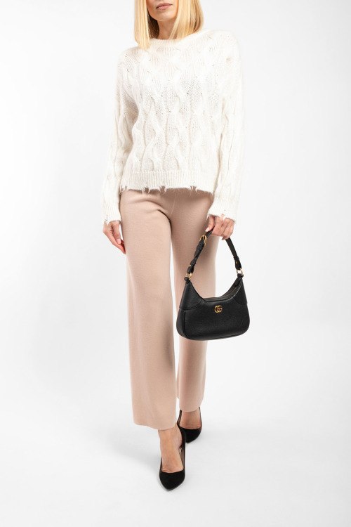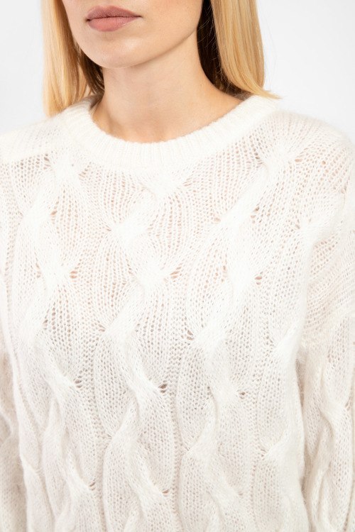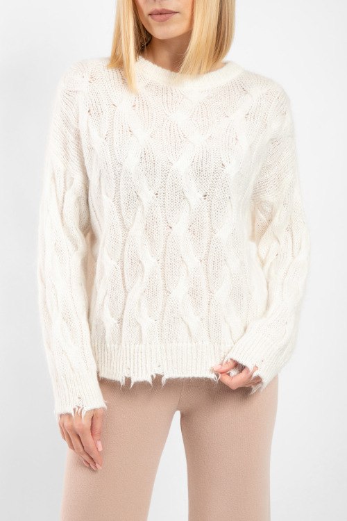 Женский джемпер молочного оттенка из полиакрила и мохера от Kontatto (Контатто). Фактурная вязка, круглый вырез горловины, длинные рукава, необработанные края.