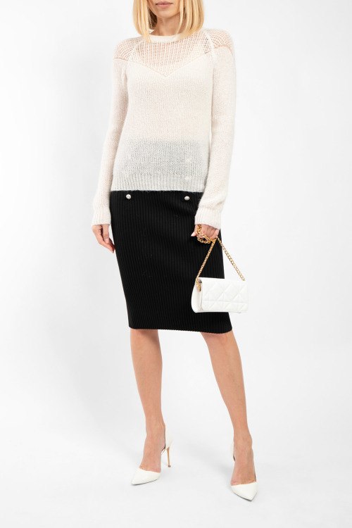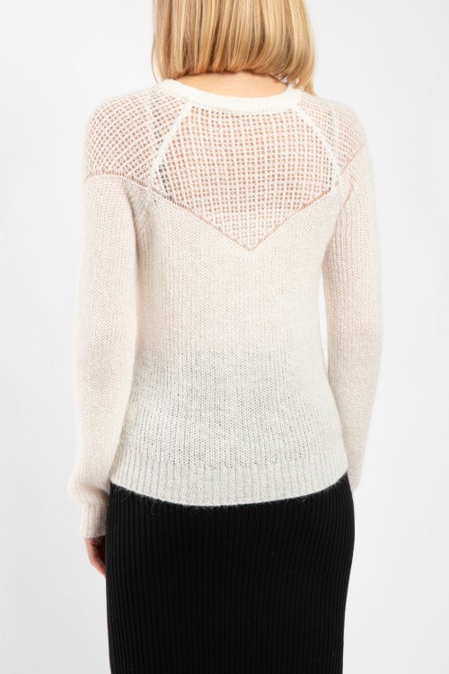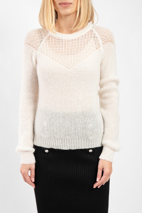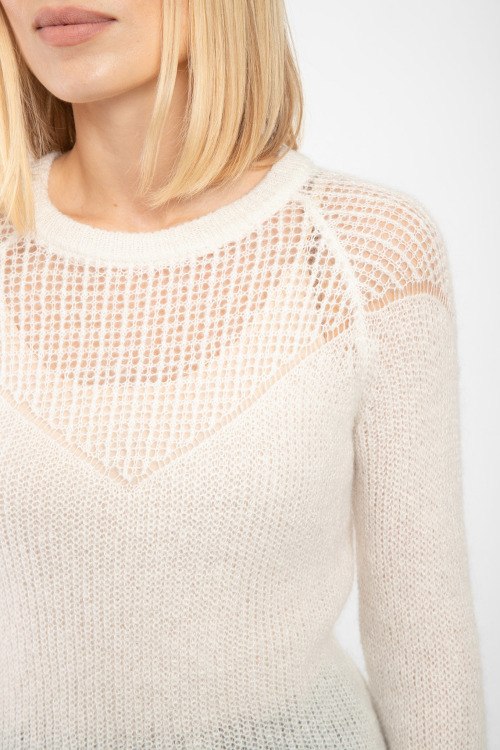 Женский джемпер молочного оттенка из акрила и мохера от Kontatto (Контатто). Круглый вырез горловины, длинные рукава-реглан, перфорированная вставка. Замеры для размера UNI: длина: 59 см, ширина по груди: 45 см, ширина по талии: 43 см, длина рукава по внутреннему шву: 53 см, ширина рукава: 13,5 см.