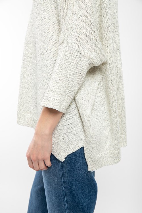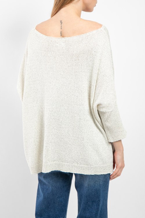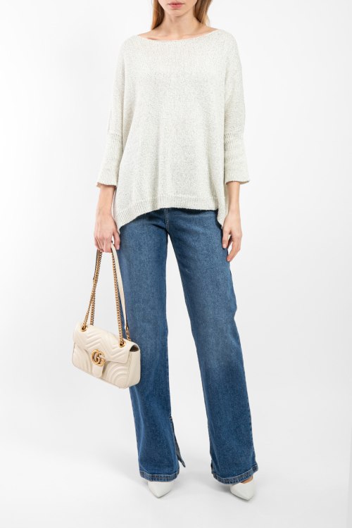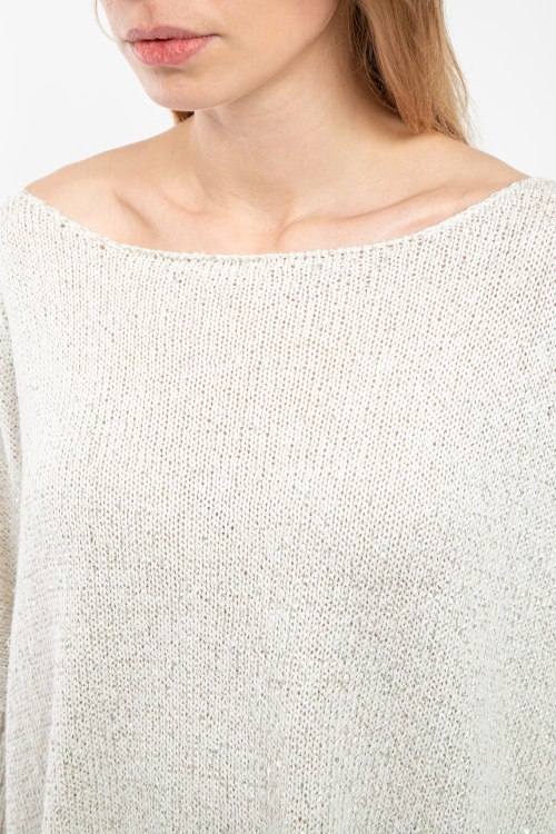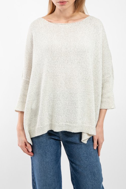 Женский джемпер молочного оттенка из полиэстера и хлопка от Kontatto (Контатто). Удлиненная модель oversize, дизайн с люрексом, ассиметричный низ изделия, вырез горловины "лодочка", укороченные рукава, приспущенная линия плеча, трикотажная резинка на манжетах, по бокам разрезы. Замеры для размера UNI: Длина: 59 см, ширина по груди: 77 см, ширина по талии : 74 см, длина рукава: 17 см, ширина рукава: 13 см.