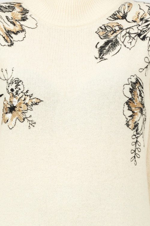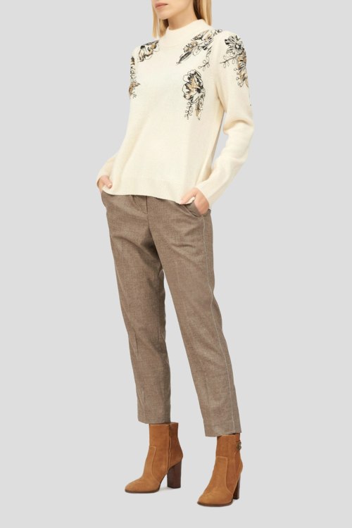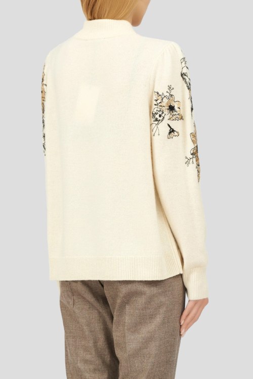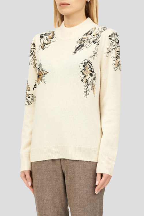Детали: Женский джемпер молочного оттенка из шерсти от Marina Rinaldi (Марина Ринальди). Круглый вырез горловины, длинные рукава, трикотажная резинка на манжетах и по низу изделия, модель декорирована принтом и пайетками