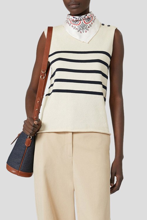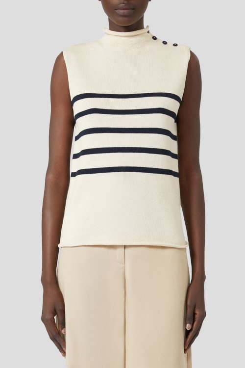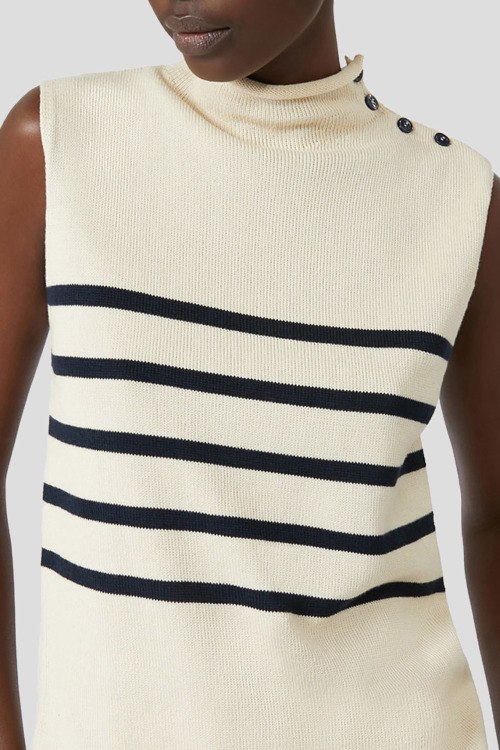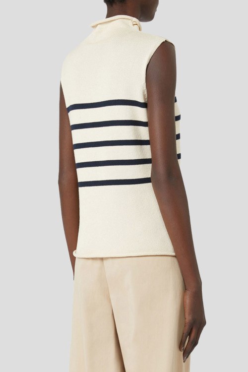 Детали: Женский хлопковый джемпер молочного оттенка Trofeo от Max Mara Weekend (Макс Мара Викенд). Модель без рукавов, дизайн в рубчик, воротник-стойка, застежка на пуговицы на плече, темная полоска, классическая длина