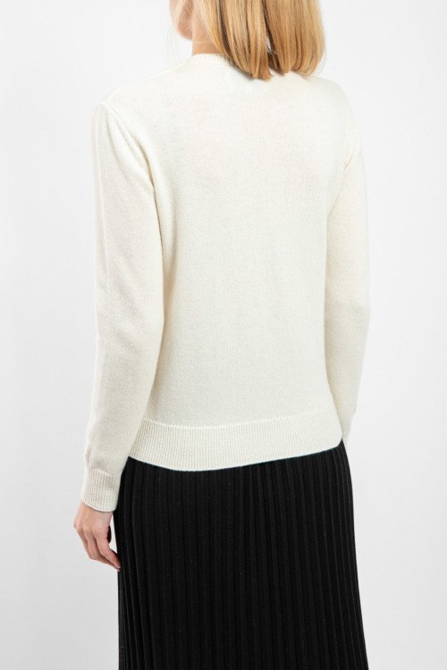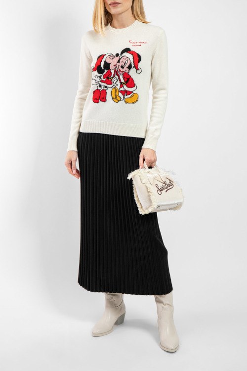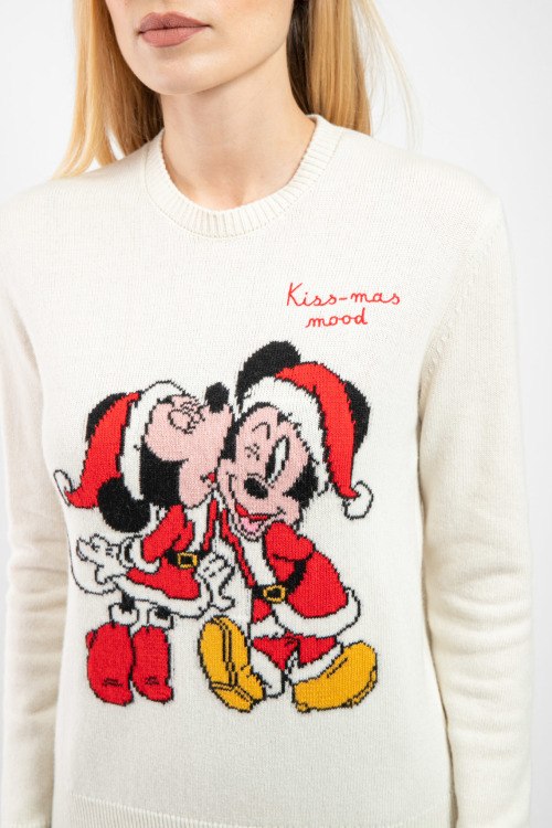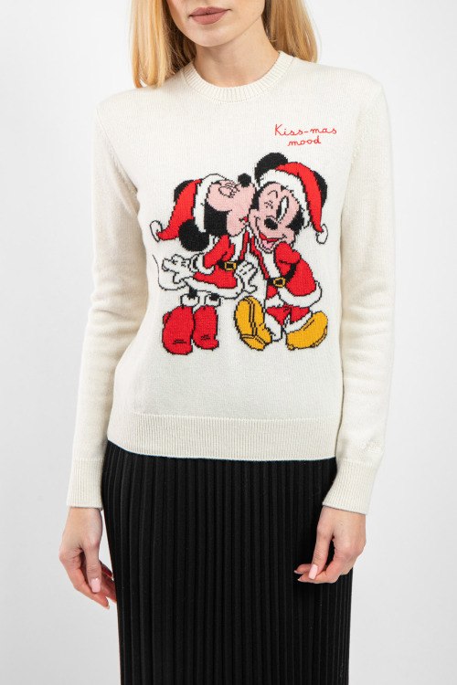 Женский джемпер молочного оттенка Kiss-Mas Mood из шерстяного микса от Mc2 Saint Barth (Mc2 Сент Барт). Круглый вырез горловины, длинные рукава, модель декорирована принтом.