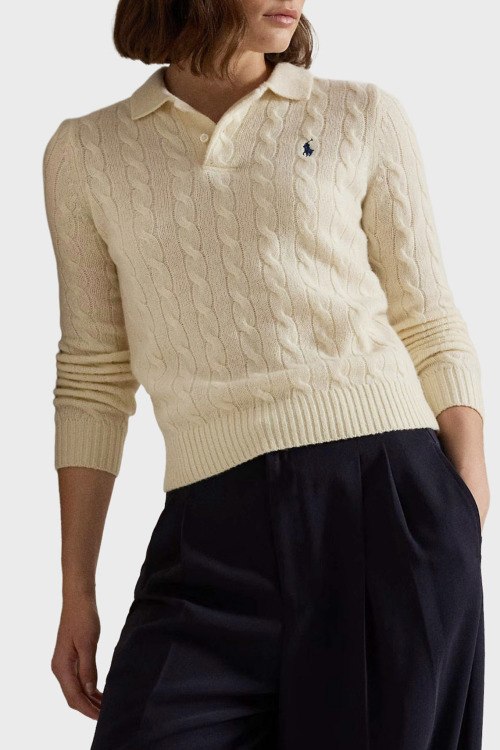 Детали: Женский джемпер-поло молочного оттенка из шерсти и кашемира от Polo Ralph Lauren (Поло Ральф Лорен). Классический воротник, V-образный вырез горловины, манжеты и низ изделия в рубчик, вышитый логотип бренда
