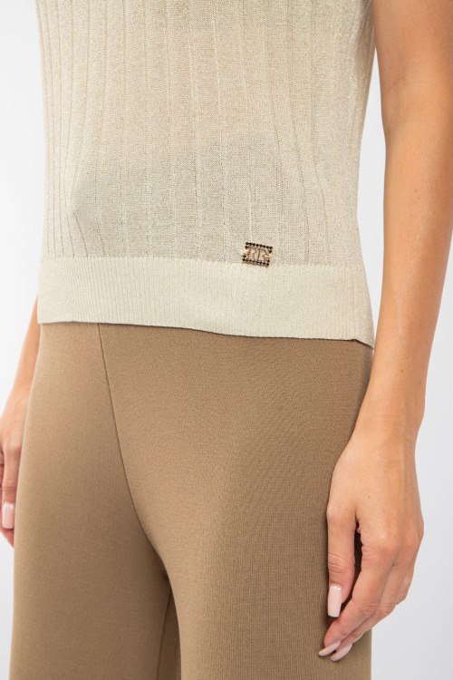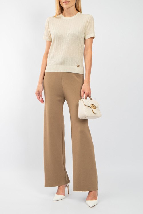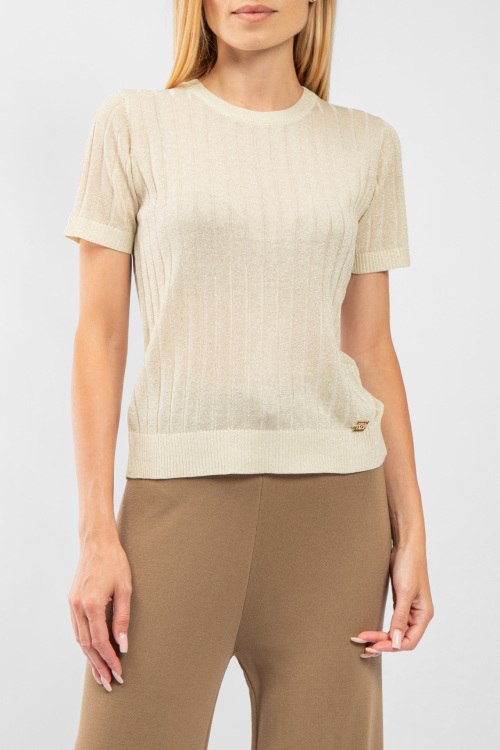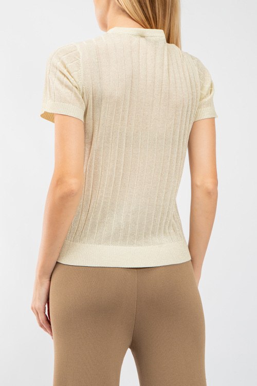 Женский кремовый трикотажный джемпер от Roberta Biagi (Роберта Бьяджи). Дизайн с люрексом, нашивка с логотипом, круглый вырез горловины, короткий рукав, классическая длина. На модели снят размер - UNI. Параметры модели: рост 177 см, 88-62-90 см. Замеры: длина: 54,5 см, ширина по груди: 45 см, ширина по талии 44 см, ширина рукава 16 см, длина рукава 6,5 см