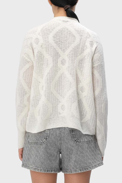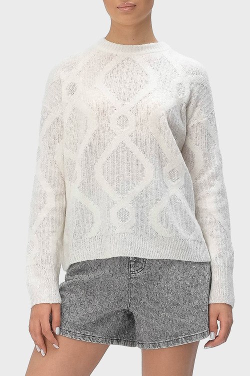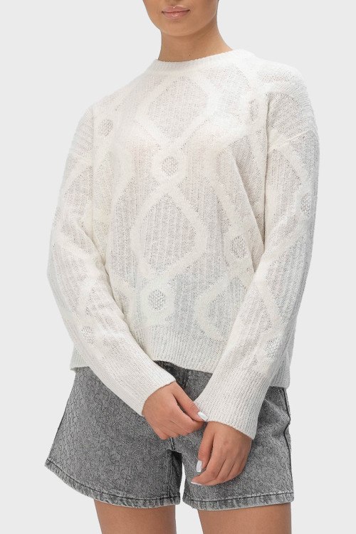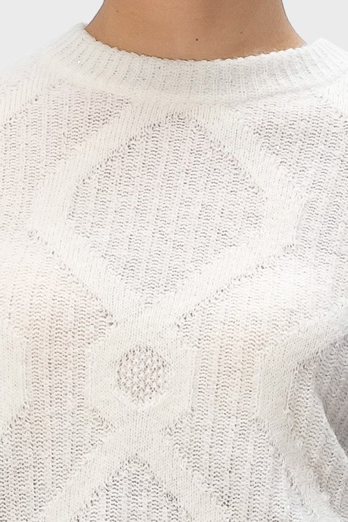Детали: Женский джемпер молочного оттенка из шерсти мериноса и нейлона от Tonet (Тонет). Круглый вырез горловины, фактурная вязка, приспущенная линия плеча, длинные рукава, манжеты и низ изделия в рубчик