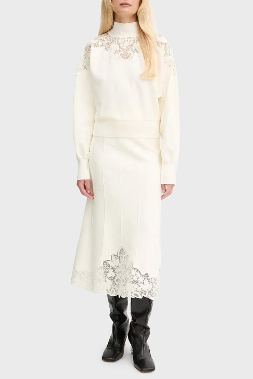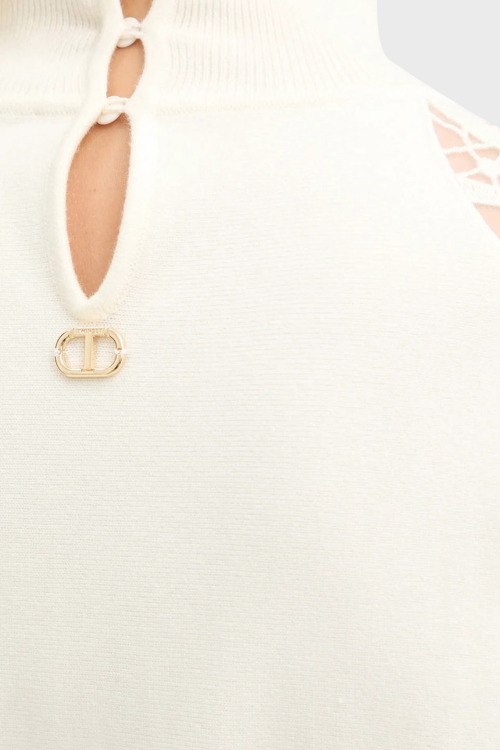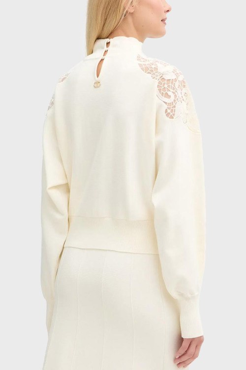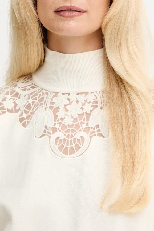Детали: Женский кремовый джемпер из вискозы от TWINSET (Твинсет). Кружевные вставки, высокая горловина, классическая длина, манжеты и нижний край в рубчик