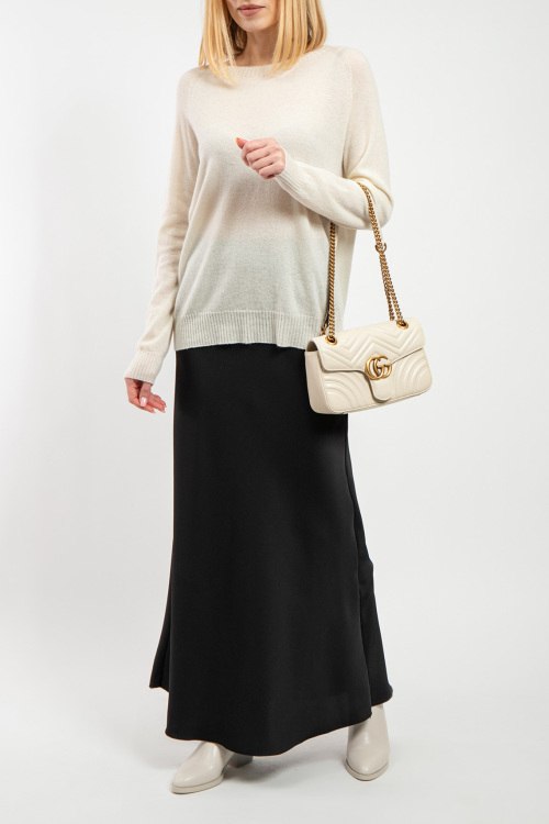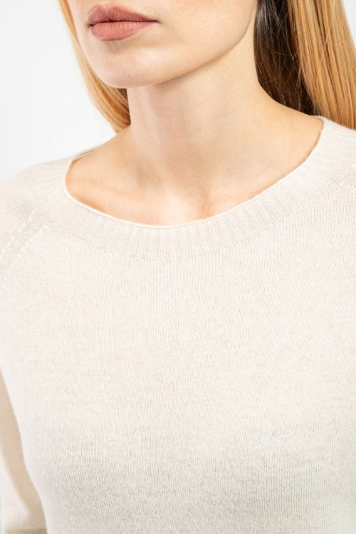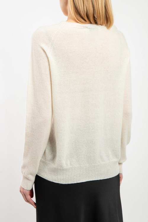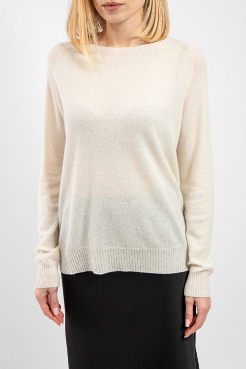 Женский джемпер из шерсти и кашемира молочного оттенка от Vicolo (Виколо). Круглый вырез горловины, манжеты и нижний край в рубчик, удлиненная длина.