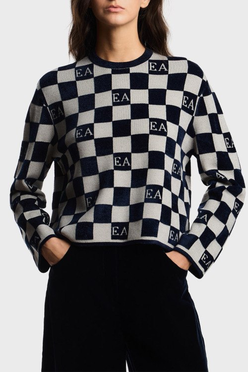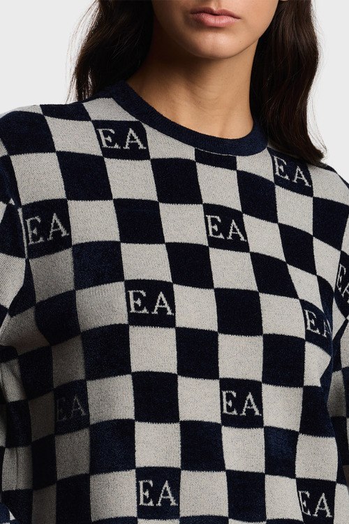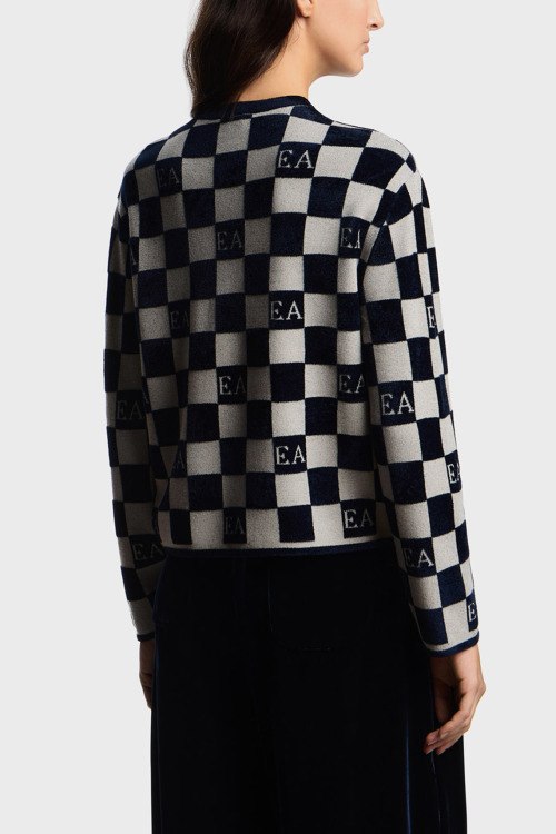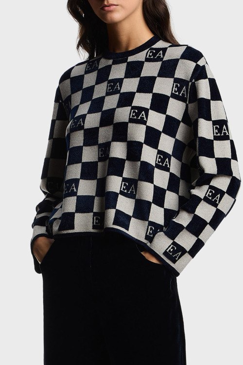 Детали: Женский черно-белый джемпер из вискозы и полиамида от Emporio Armani (Эмпорио Армани).Круглый вырез горловины, дизайн в клетку, логотип бренда