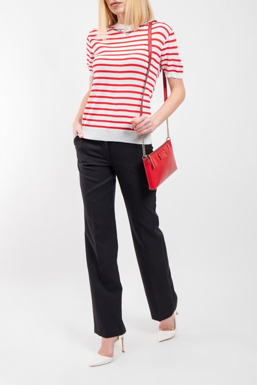 Женский красно-белый джемпер из хлопка от Barbara Alvisi (Барбара Алвиси). Классическая длина, круглый вырез горловины, короткие рукава, дизайн в полоску, декорирована вышивкой. Замеры для размера S/M: длина: 61 см, ширина по груди: 45 см, ширина по талии: 43 см, ширина по бедрам 37 см длина рукава по внутреннему шву: 10 см, ширина рукава: 17 см.