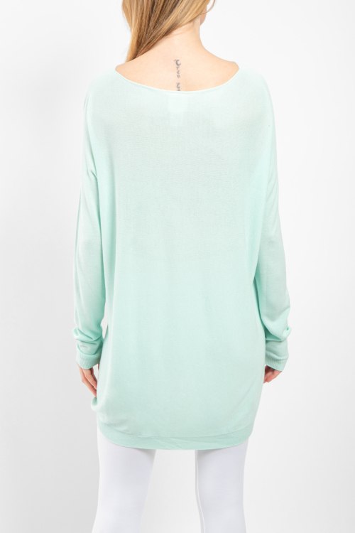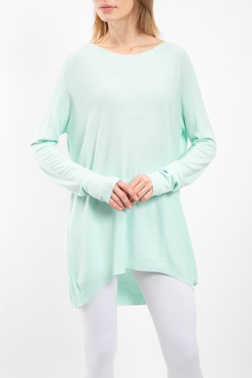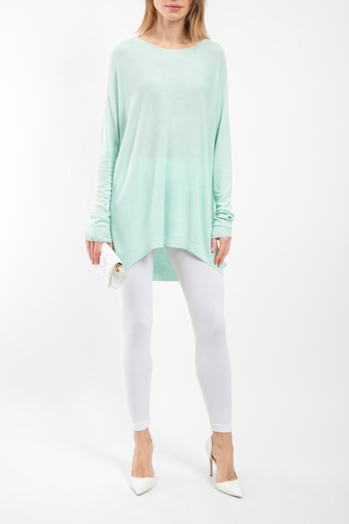 Женский мятный джемпер из вискозы и полиэстера от Kontatto (Контатто). Удлиненная модель, вырез горловины "лодочка", цельнокроеные рукава, Замеры для разхмера UNI: Длина: 70 см, ширина по груди: 56 см, ширина по талии : 55 см, ширина по бедрам: 55 см, длина рукава: 50 см, ширина рукава: 14 см.