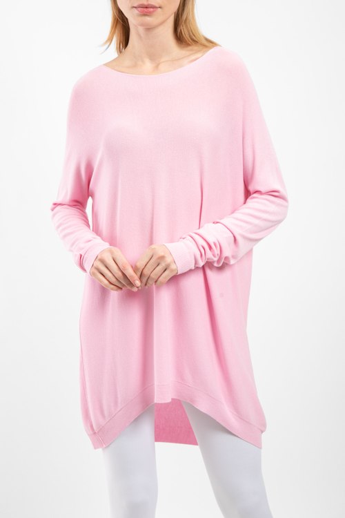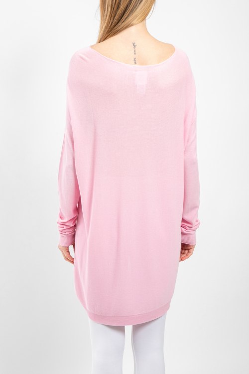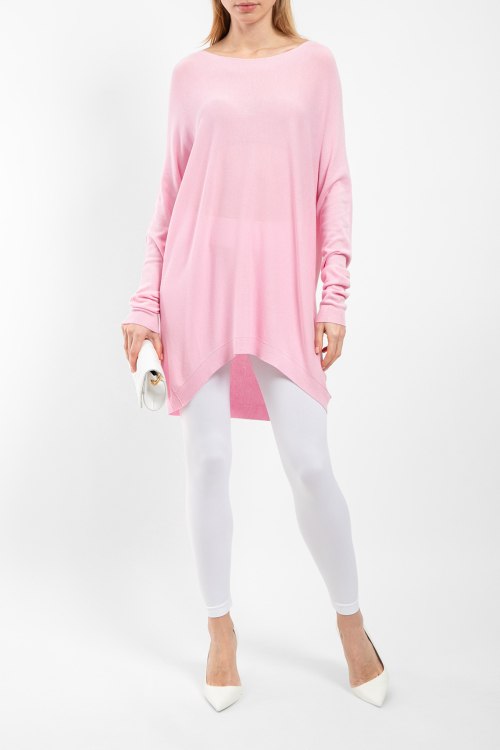 Женский розовый джемпер из вискозы и полиэстера от Kontatto (Контатто). Удлиненная модель, вырез горловины "лодочка", цельнокроеные рукава, Замеры для размера UNI: Длина: 70 см, ширина по груди: 56 см, ширина по талии : 55 см, ширина по бедрам: 55 см, длина рукава: 50 см, ширина рукава: 14 см.