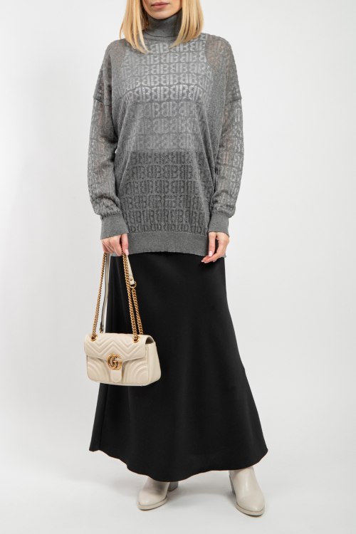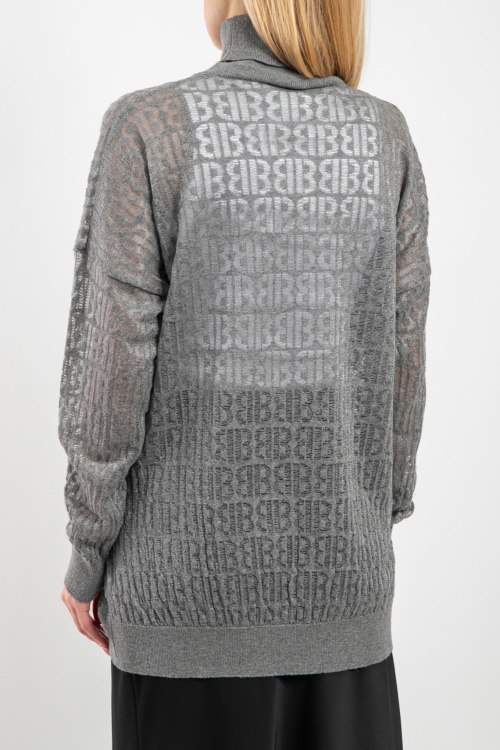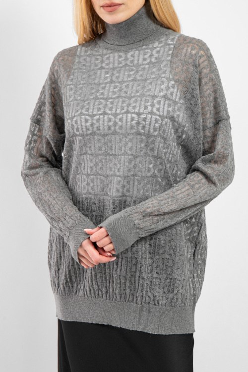 Женский серый джемпер из акрила и вискозы от Barbara Alvisi (Барбара Алвиси). Полупрозрачная модель с примесью шерсти, монограмма по всей поверхности, высокая горловина, манжеты и нижний край в рубчик, удлиненная длина.