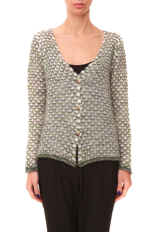 Детали: Вязаная кофта на пуговицах с длинным рукавом, глубокий вырез декольте
