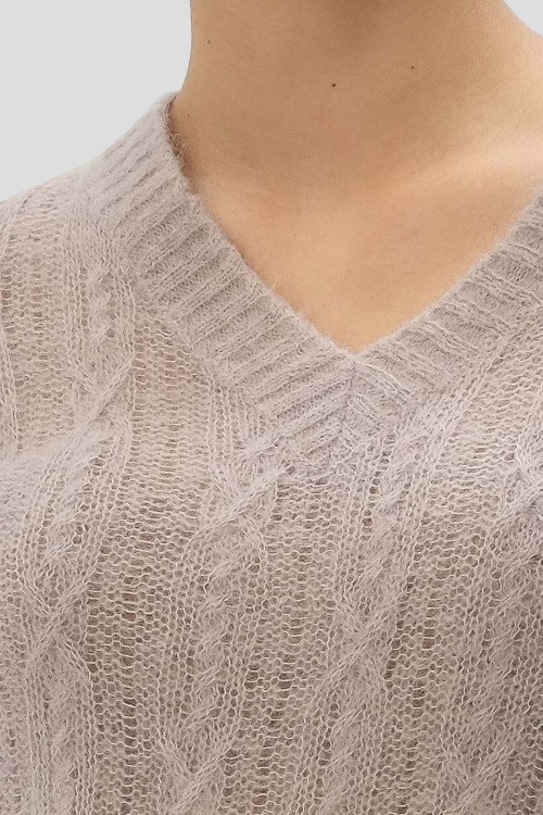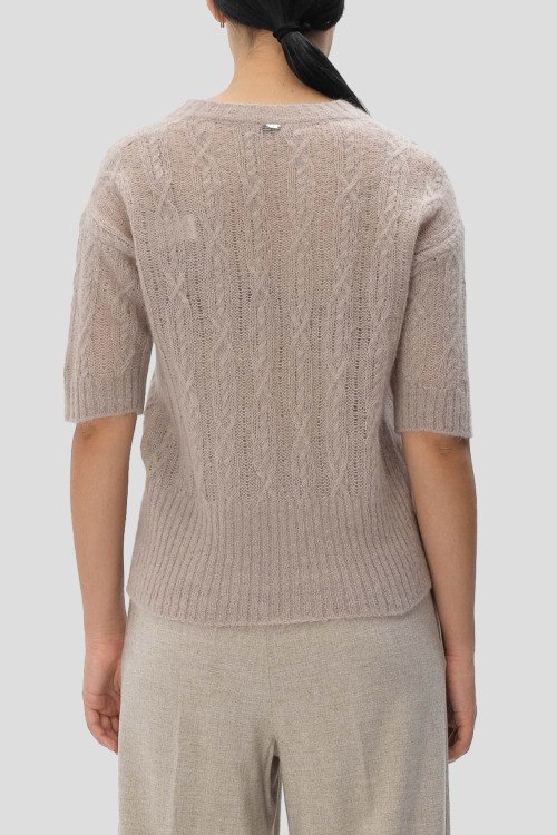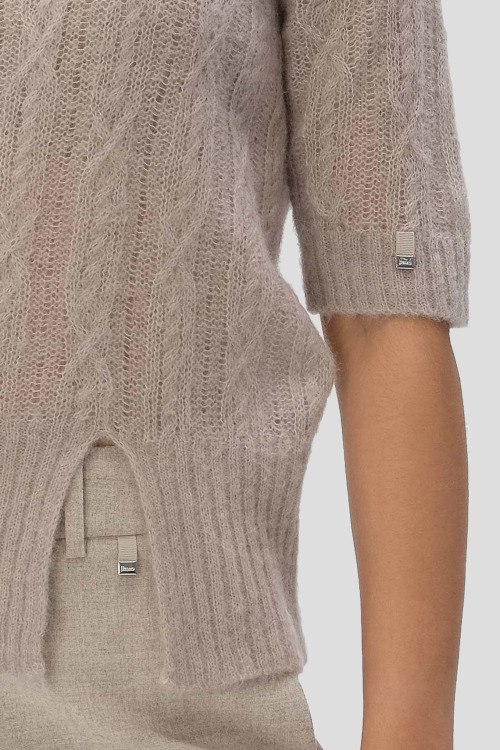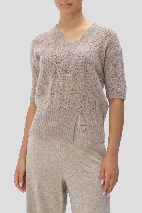 Женский пуловер из альпаки и шерсти цвета тауп от Herno (Эрно). Комбинированная вязка, V-образный вырез, короткий рукав, разрез сбоку, классическая длина