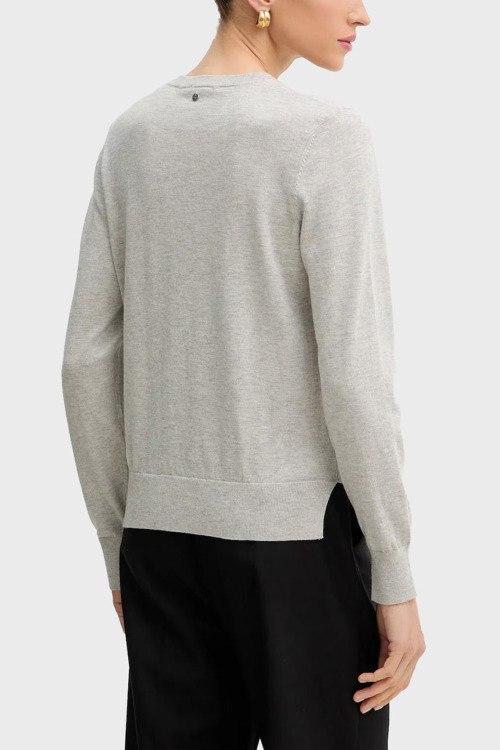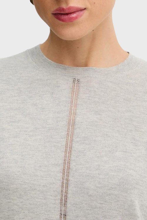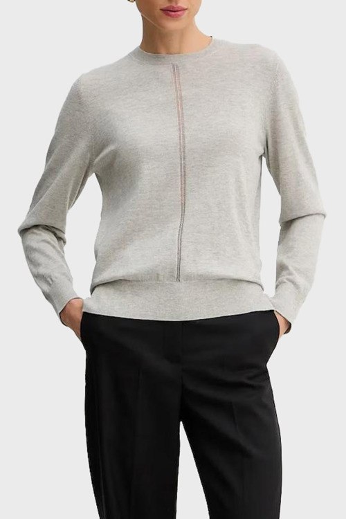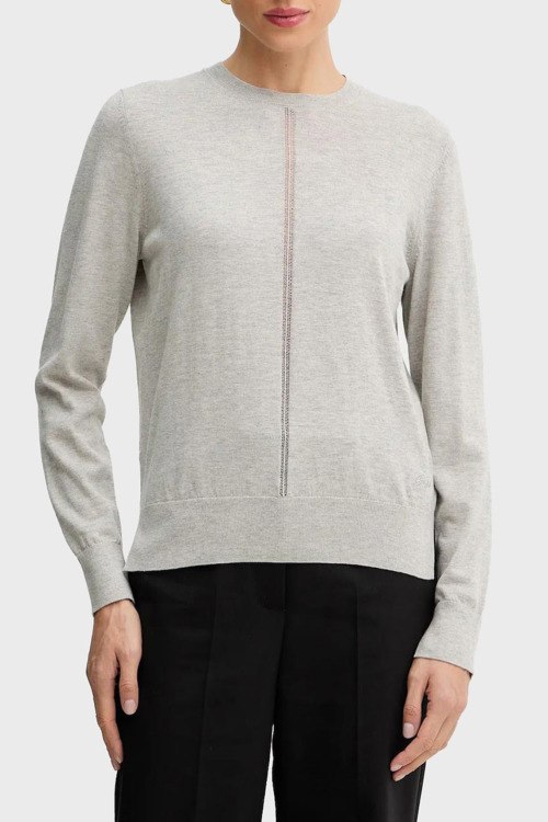 Детали: Женский серій джемпер из шерсти и хлопка от Hugo Boss (Хуго Босс). Классическая длина, круглый вырез горловины, длинные рукава, перфорированная вставка, по бокам разрезы