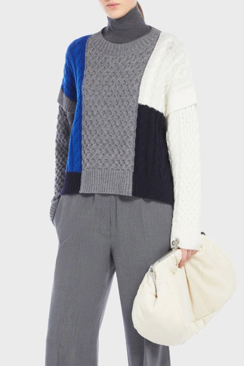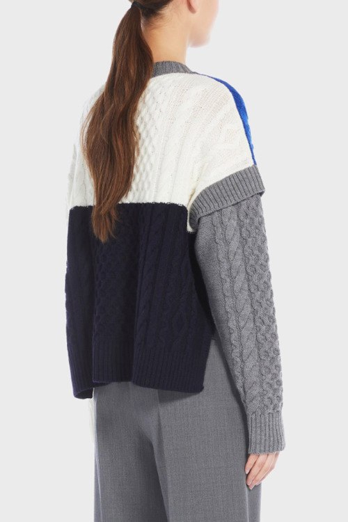 Детали: Женский серый джемпер из шерсти от Max Mara Weekend (Макс Мара Викенд). Комбинированный дизайн, круглый вырез горловины, длинные рукава, по бокам разрезы, трикотажная резинка на манжетах и по низу изделия
