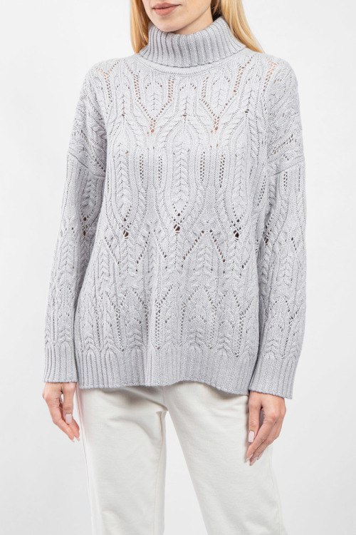 Женский серый джемпер из шерсти и шелка от Panicale Cashmere (Паникале Кашемир). Модель с примесью кашемира, вязаный узор, высокая горловина, спущенная линия плеча, удлиненная длина.