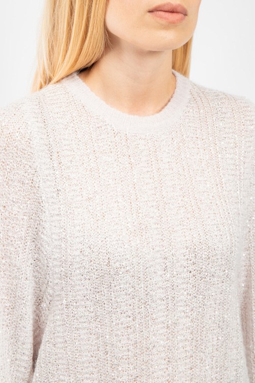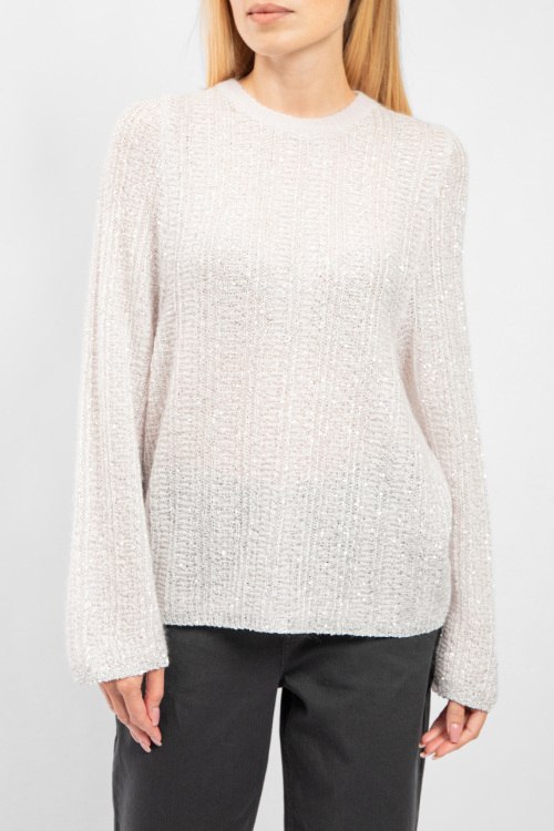 Женский светло-серый джемпер из альпаки и мохера от Panicale Cashmere (Паникале Кашемир). Декор пайетками, круглый вырез горловины, классическая длина. Размер вещи на фото: 44. Замеры: длина спереди: 62 см, ширина по груди: 57 см, ширина по талии 54 см, длина рукава 37 см, ширина рукава 19 см.