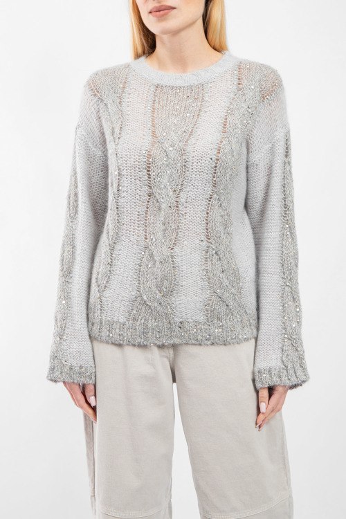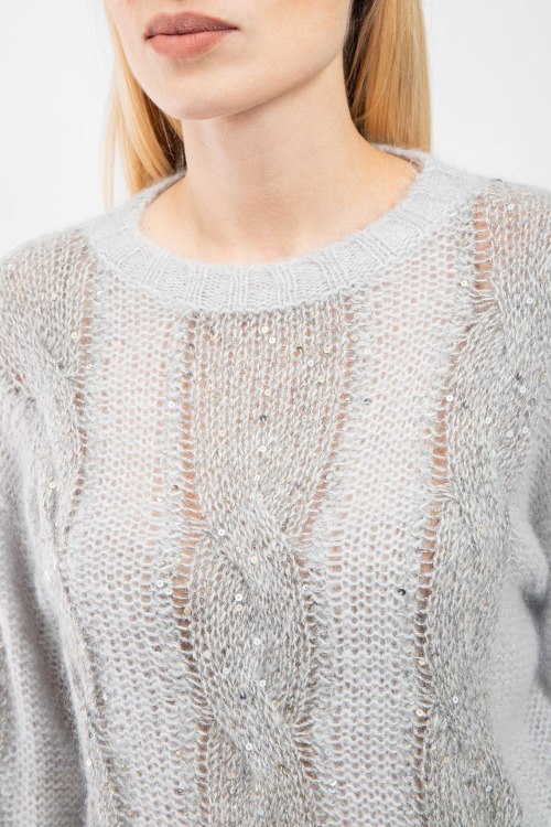 Женский серый джемпер из альпаки и мохера от Panicale Cashmere (Паникале Кашемир). Декор пайетками, узор крупной косичкой, круглый вырез горловины, спущенная линия плеча, широкий рукав, классическая длина.