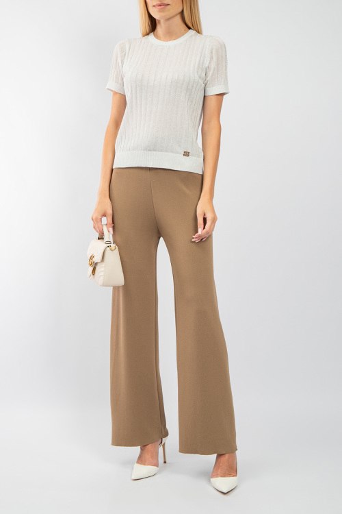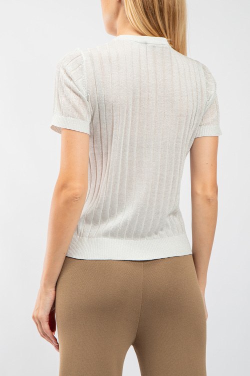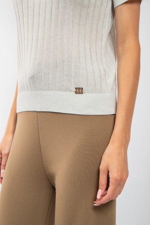 Женский светло-серый трикотажный джемпер от Roberta Biagi (Роберта Бьяджи). Дизайн с люрексом, нашивка с логотипом, круглый вырез горловины, короткий рукав, классическая длина. На модели снят размер - UNI. Параметры модели: рост 177 см, 88-62-90 см. Замеры: длина: 54,5 см, ширина по груди: 45 см, ширина по талии 44 см, ширина рукава 16 см, длина рукава 6,5 см