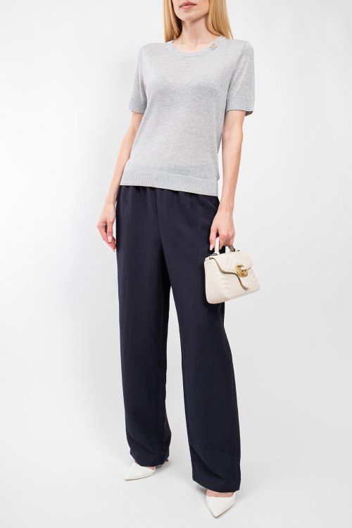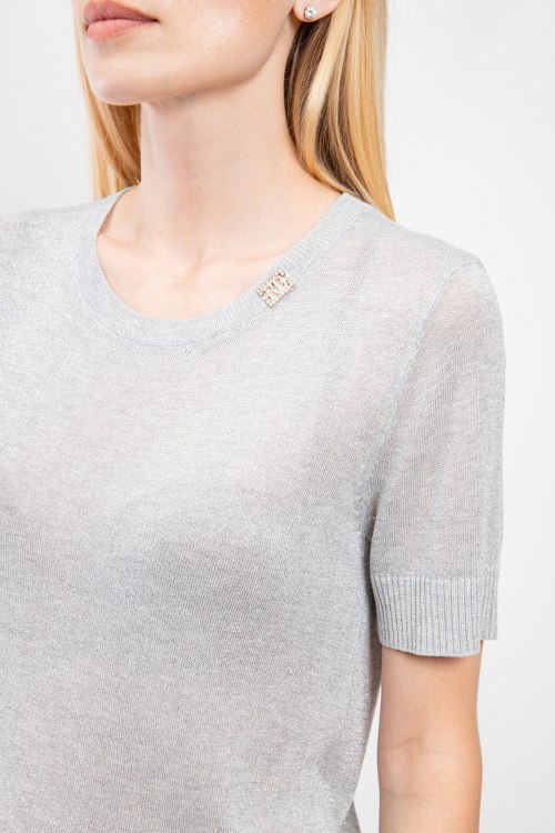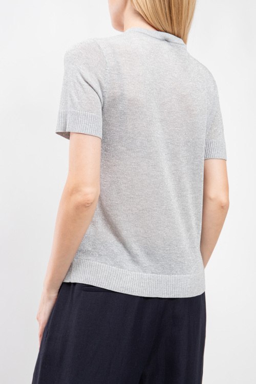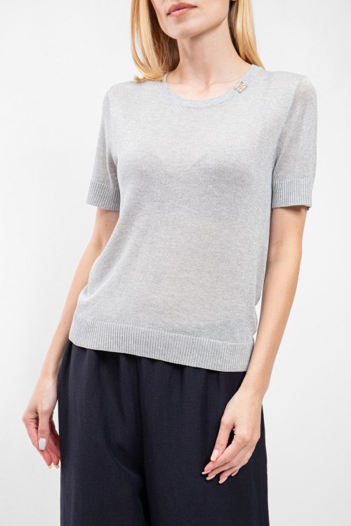 Женский серебристый трикотажный джемпер от Roberta Biagi (Роберта Бьяджи). Дизайн с люрексом, значок с логотипом, круглый вырез горловины, короткий рукав, классическая длина. Замеры для размера Uni: длина спереди: 67 см, ширина по груди: 45 см, ширина по талии: 45 см, длина рукава: 7 см, ширина рукава: 12 см.