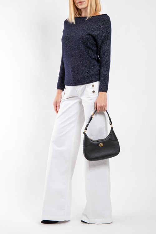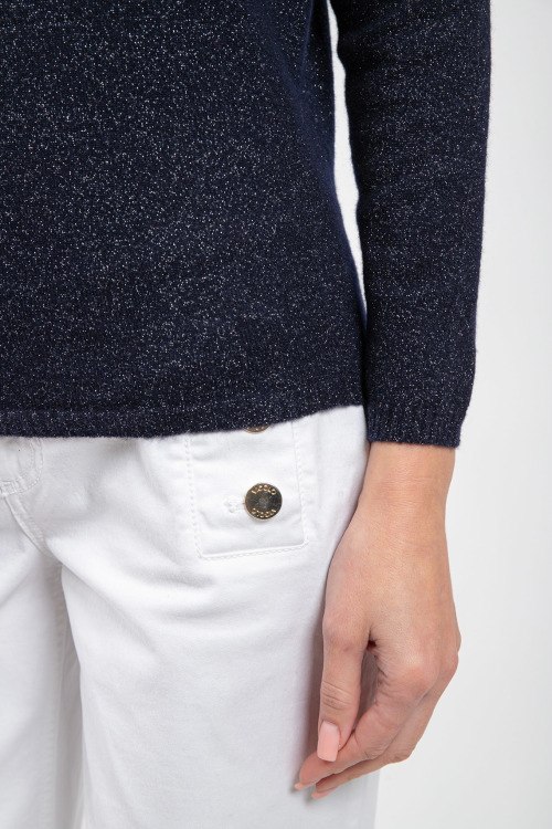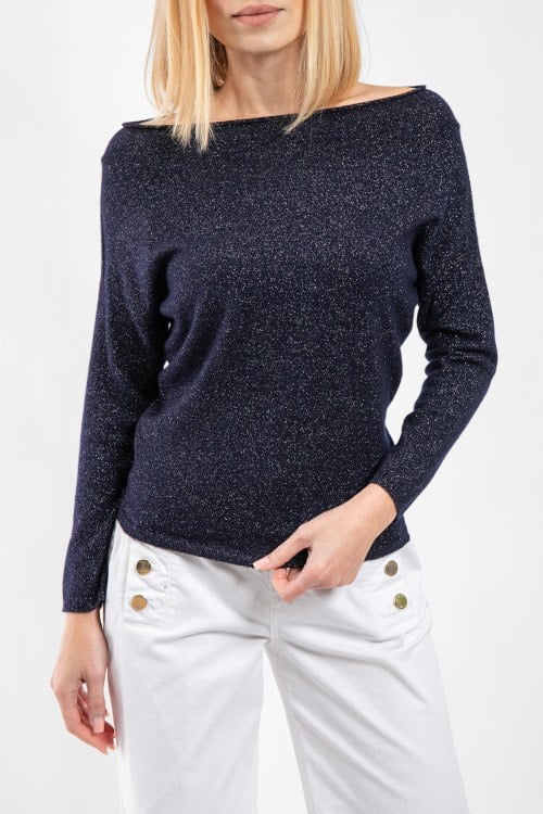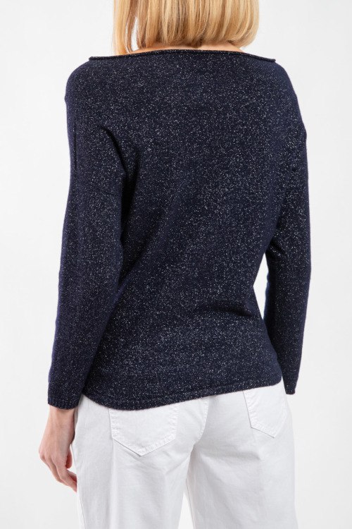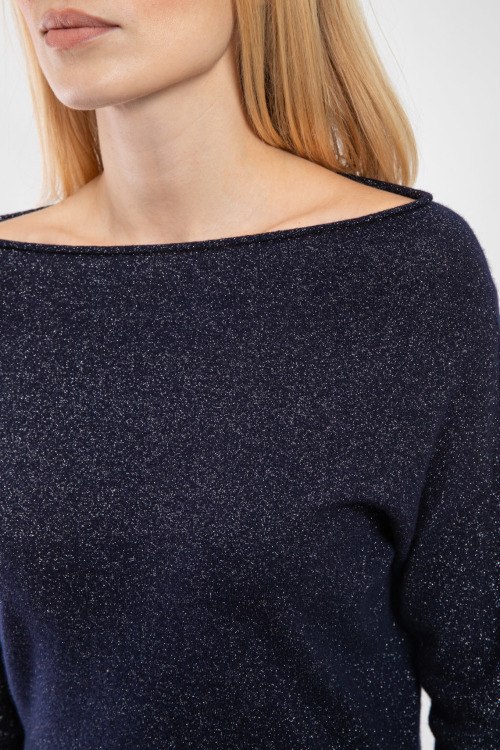 Женский темно-синий джемпер из шерсти и кашемира от Kontatto (Контатто). Вырез горловины "лодочка", длинны рукава, модель декорирована люрексовой нитью. Замеры для размера UNI: длина: 55 см, ширина по груди: 48 см, ширина по талии: 41 см, длина рукава по внутреннему шву: 39 см, ширина рукава: 15 см.