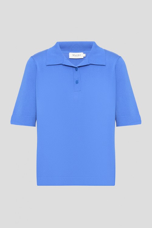 Детали: Женский синий трикотажный джемпер-поло от Maerz (Маерз). Отложной воротник, застежка на две пуговицы, короткий рукав, классическая длина. Обхват груди: для размера 36 - 96 см, обхват талии: для размера 36 - 98 см, длина изделия по среднему шву спинки от горловины: для размера 36 - 58 см