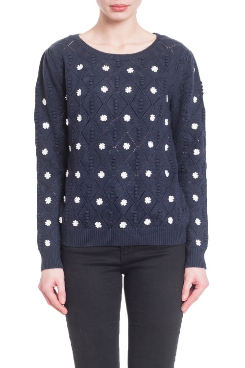 Детали: Комбинированная кофта с длинными рукавами, декорирована рельефной вязкой и контрастными цветочками