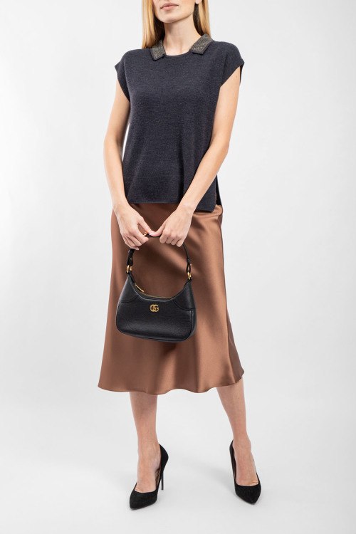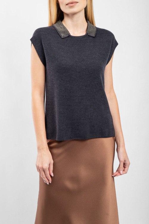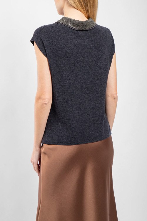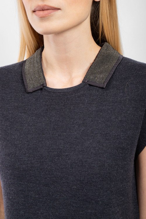 Детали: Женский темно-серый шерстяной джемпер-поло от Brunello Cucinelli (Брунелло Кучинелли). Отложной воротник с кристаллами, короткий рукав, классическая длина