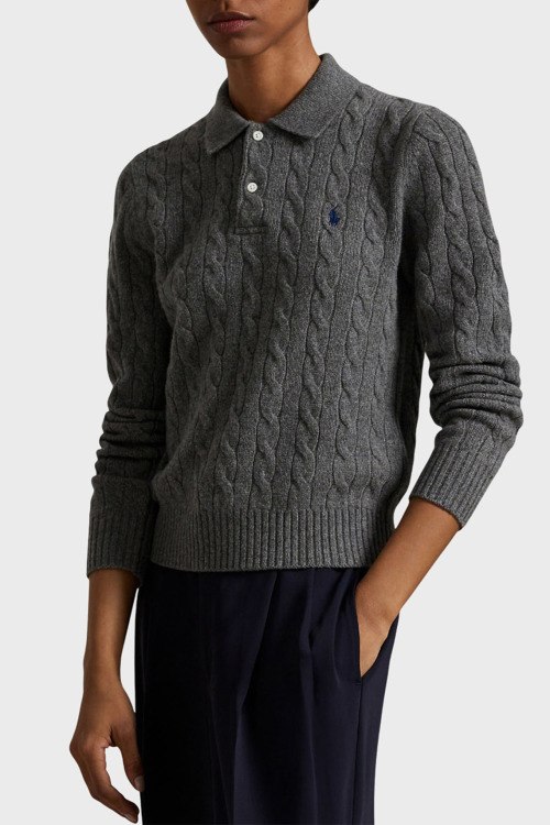 Детали: Женский темно-серый джемпер-поло из шерсти и кашемира от Polo Ralph Lauren (Поло Ральф Лорен). Классический воротник, горловина на пуговицах, длинные рукава, манжеты и низ изделия в рубчик, вышитый логотип бренда