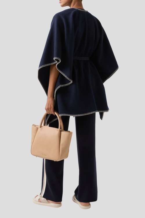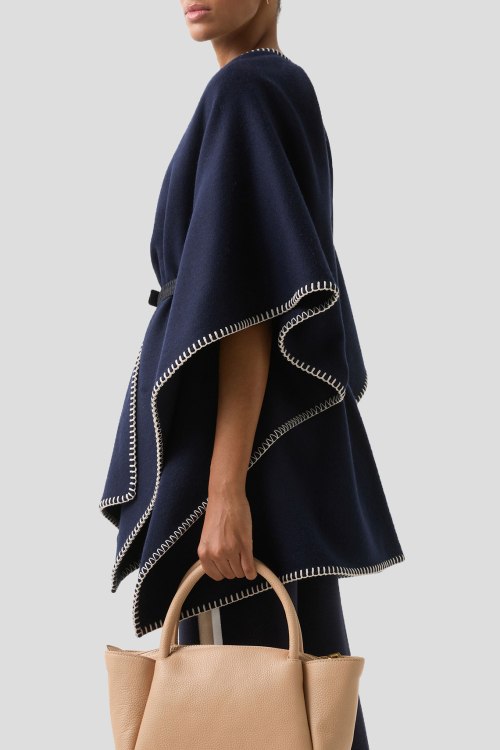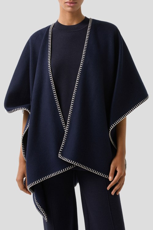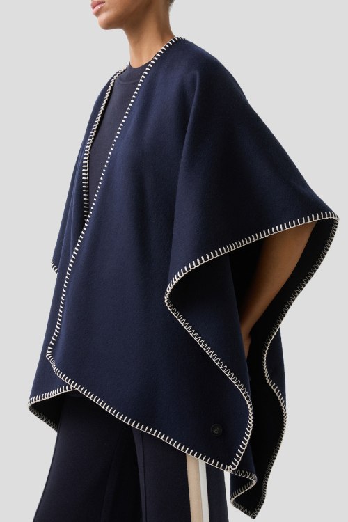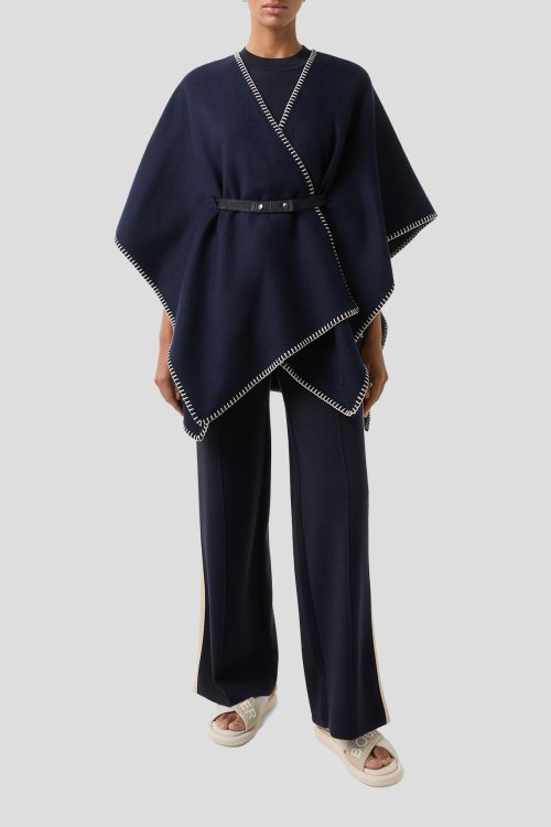 Детали: Женское темно-синее пончо Nancie из шерстяного микса от Bogner (Богнер). Декоративная строчка контрастного цвета, модель свободного кроя, застежка на эластичный нейлоновый пояс и кнопки