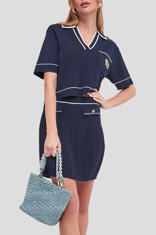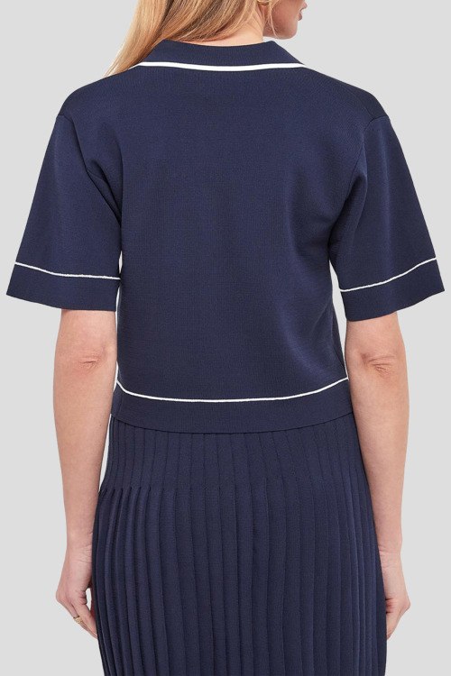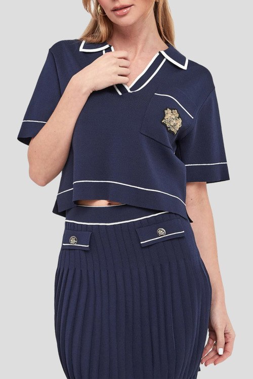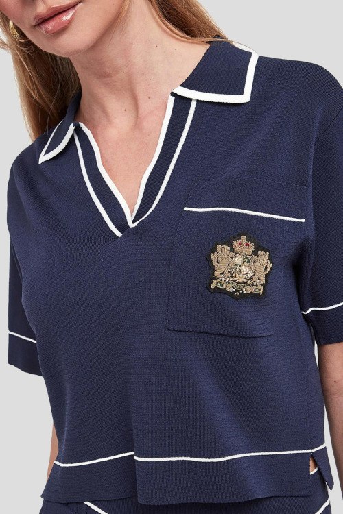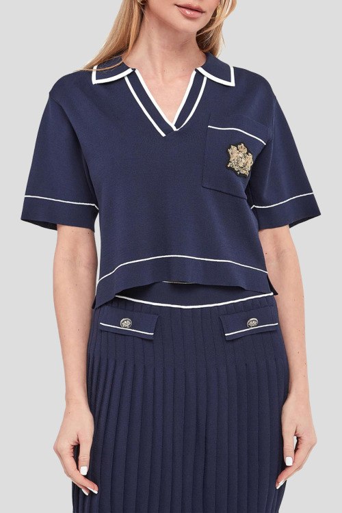 Детали: Женский темно-синий джемпер-поло из вискозного микса от Ermanno Ermanno Scervino (Эрманно Эрманно Шервино). Укороченная длина, V-образный вырез горловины, отложной воротник, короткие рукава, нагрудный карман, патч-лого, контрастная окантовка