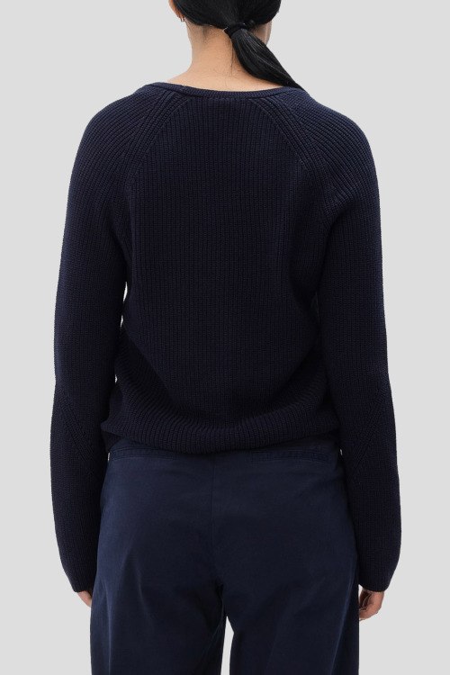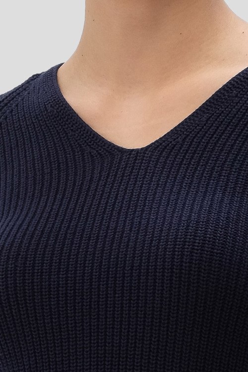 Детали: Женский темно-синий хлопковый пуловер от Hugo Boss (Хуго Босс). Вязаная модель, V-образный вырез, классическая длина