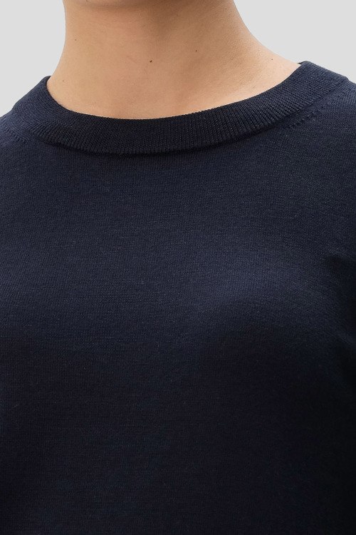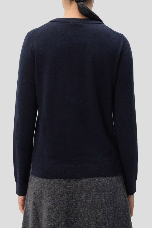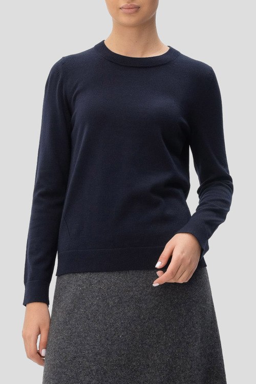 Детали: Женский темно-синий шерстяной джемпер Feganasi от Hugo Boss (Хуго Босс). Круглый вырез горловины, классическая длина, манжеты и нижний край в рубчик