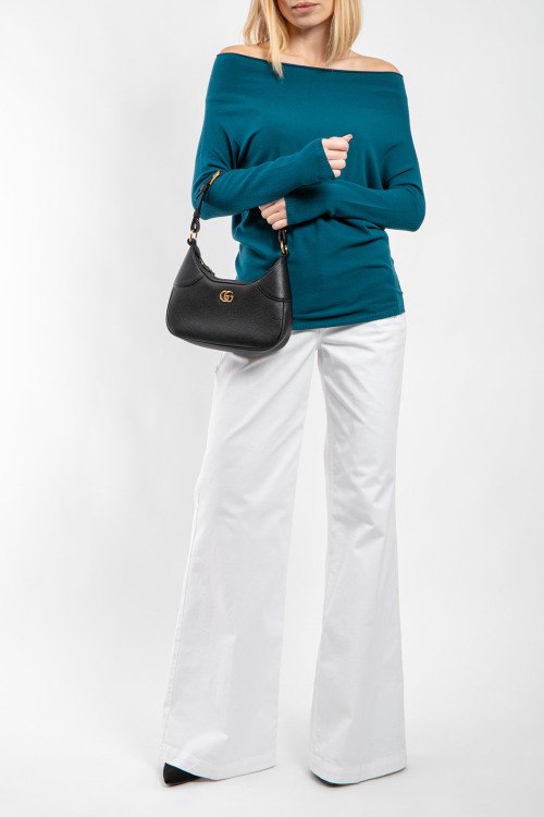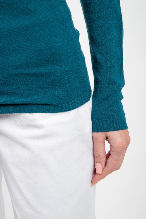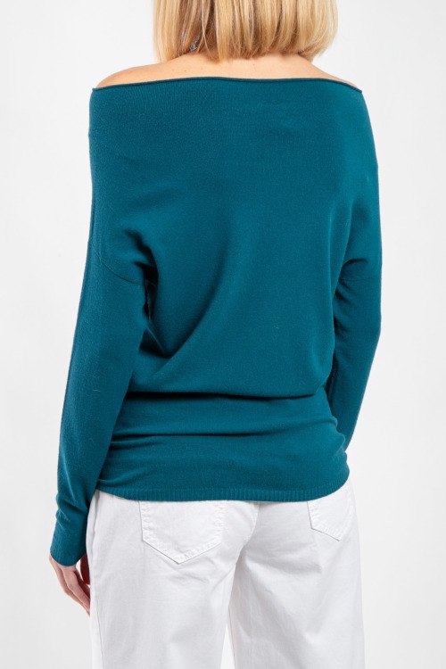 Женский джемпер цвета морской волны из вискозного микса от Kontatto (Контатто). Вырез горловины "лодочка", длинные цельнокроеные рукава. Замеры для размеры UNI: длина: 62 см, ширина по груди: 48 см, ширина по талии: 43 см, ширина по бедрам: 38 см, длина рукава по внутреннему шву: 42 см, ширина рукава: 13 см.
