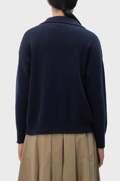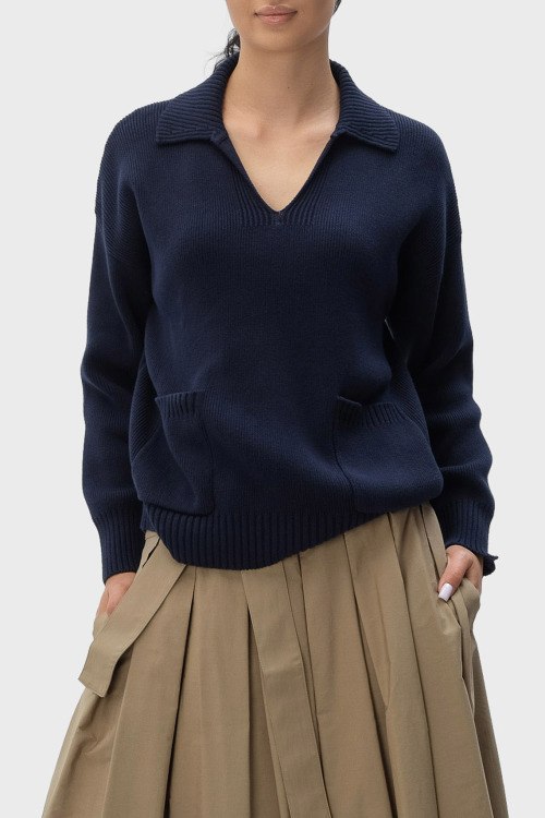 Детали: Женский темно-синий хлопковый джемпер-поло от Max Mara Weekend (Макс Мара Викенд). Отложной воротник, V-образный вырез, два накладных кармана, классическая длина, ребристые манжеты и нижний край