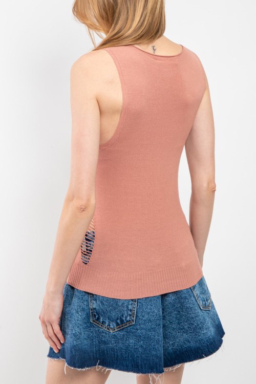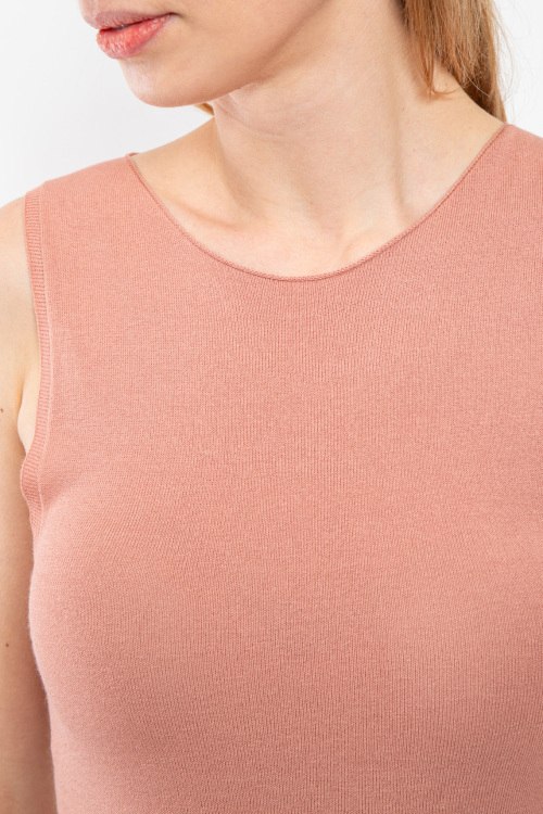 Женский светло-терракотовый трикотажный топ от Kontatto (Контатто). Модель без рукавов, круглый вырез горловины, классическая длина. Замеры для размера UNI: длина: 57 см, ширина по груди: 33 см, ширина по талии: 33 см.